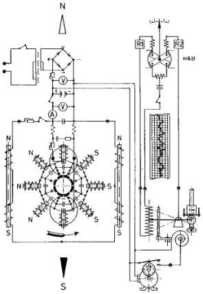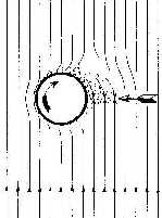 Вращение солнца и планет вокруг их собственных осей можно объяснить в очень простой и иллюстративной манере, используя эту вихревую теорию. Мы можем получить правильное представление об этом явлении, посмотрев на известное электрическое колесо или летящее колесо, показанное на рис. 54, разрядка на наконечнике которого заставляет колесо вращаться в противоположном направлении. Этот же принцип применим к вихрям действительного электричества. Восходящие восточно-западные вихревые потоки планет толкают их в противоположном, то есть западно-восточном, направлении и таким образом передают непрерывный крутящий момент на планеты. Ранее мы обнаружили, что, кроме вихрей действительного солнечного электричества, планеты имеют собственные вихри, восходящие изнутри. Именно этот вихрь дает планетам их осевое вращение. Здесь следует принимать во внимание, какой тепловой градиент и следовательно какое напряжение и плотность имеет восходящий вихрь. Около солнца напряжение солнечного электрического вихря очень высоко, в то время как его плотность низка; аналогично, направленный наружу тепловой градиент восходящего действительного планетарного электричества низок около солнца, то есть близкие к солнцу планеты, а именно Меркурий и Венера, вращаются вокруг своей оси медленно, в то время как их вращение вокруг солнца быстрее благодаря более высокой концентрации и более высокому напряжению действительного солнечного вихря и более сильным результирующим компонентам накопления по сравнению с вращением по орбитам более далёких от солнца планет. Таким образом, чем дальше мы перемещаемся от солнца, тем более уменьшаются напряжение и концентрация действительного солнечного электричества и тем медленнее будет орбитальное вращение планет. Альтернативно, направленный наружу тепловой градиент планет из зоны равновесия становится больше и увеличивает взаимообратные вихревые силы, таким образом заставляя планеты вращаться быстрее вокруг их собственных осей благодаря более высоким крутящим моментам. Чем ближе планеты подходят к солнцу, тем более низкими становятся их крутящие моменты, но тем большими становятся их результирующие силы накопления, которые вызывают их вращение вокруг солнца. Что касается самого солнца, мы осознаём вращение в противоположную сторону по причине газообразного физического состояния мантии солнца. Здесь вещества не толкаются назад, а увлекаются восточно-западным солнечным электрическим вихрем в том же направлении. Следовательно, солнце вращается вокруг своей оси с востока на запад, причём быстрее на экваторе, где напряжение восходящего действительного солнечного электричества наиболее высоко, чем на широте приблизительно 40 градусов, где задержка вращения составляет до двух дней.