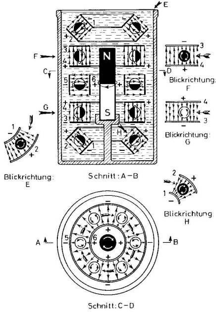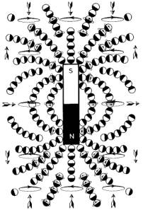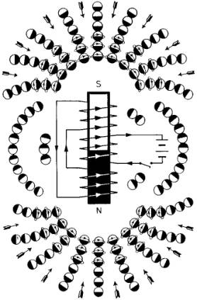 Это непрерывно расширяющееся ядерное электричество солнца выдавливается из солнца, как из почти вечного колодца, и течёт, в соответствии со своим первичным состоянием, по направлению к холодным зонам планетного пространства. Как и с полюсами планеты, необходимо допустить в отношении солнечных полюсов, что возникают нисходящие винтовые потоки, и что целые газовые лоскуты располагаются подобно магнитам под прямым углом к потоку и отгоняются извне к полюсам. В соответствии с вихревыми законами, установленными в мелком масштабе, и с направлением вращения солнца и направлением вихревого потока земли, следует принять, что холодные зоны планетного пространства расширяются винтообразно и/или вихреобразно. Так что непрерывно истекающее ядерное электричество солнца текло бы к этим холодным зонам, где вихревой закон определяет направление потока между землей и солнцем, то есть на дневной стороне, с востока на запад.
