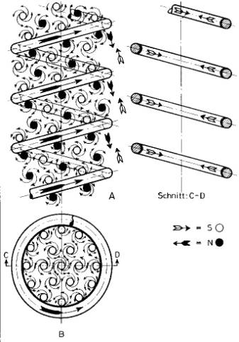 В самом деле, гигантскими телескопами в космосе обнаружено более двух тысяч миллионов спиральных структур. Судя по опубликованным результатам наблюдений спиральных туманностей, они во всех деталях соответствуют вихревому закону, описанному выше - в особенности в отношении направления движения винтовых рукавов, ядра и формирования новых звезд. Поэтому мы должны предположить, что все спиральные туманности, включая нашу систему млечного пути, которой принадлежит наша солнечная система, подчинены вселенскому вихрю, в котором все системы спиральных туманностей отталкивают друг друга не имею возможности выйти на периферию вселенского вихря, потому что это им не дали бы сделать эффектами накопления, действующие извне внутрь. Аналогично, планеты нашей солнечной системы не могут покинуть эту систему из-за эффектов накопления, действующих извне внутрь. Основание принципа потока действительного солнечного электричества нашей солнечной системы - и всех других солнечных систем в общем - это форма движения Lemniskata. Оно начинает восхождение по направлению влево от солнечного экватора до высоких градусов широты и по часовой стрелке, стремится к полюсам планет, нисходит по направлению вправо. Теперь действительное солнечное электричество течет от экваторов планет до высоких градусов широты, восходя вправо и двигаясь против часовой стрелки и нисходя влево к обоим полюсам лун. Теперь действительное солнечное электричество истекает с экваторов лун восходя влево до высоких градусов широты. Таким образом, вихревые потоки планет и лун гармонично располагаются в направлении потока солнечного гигавихря.