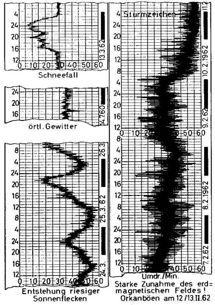 Автор сделал другое интересное наблюдение с этими весами в период с 6-ого по 13-ое сентября 1960 г. В течение этого периода несколько раз случилось, что все стрелки " по команде " перемещались в свои наивысшее позиции, оставались там в течение нескольких часов и постепенно возвращались в свои первоначальные положения. Время этих экстремальных позиций совпало с ужасными ураганами "Донна" на Американском острове Пуэрто-Рико, в Ориент Провинс, Джибаре, Флориде, и Нью-Йорке. Эти положения указателей весов позволяют заключить, что гравитационное поле земли временно увеличилось. Далее, это заключение дат возможность предположить, что в пределах зоны динамического равновесия земли произошли сильные извержения, вызвавшие экстраординарные штормы. Если бы были найдены другие подтверждения этих измеримых влияний гравитации, исследования Richarz и Krigar-Menzel должны были бы быть пересмотрены в свете этого аспекта.