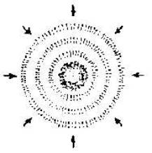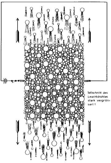 Как мы восприняли в Части Второй, посвящённой формированию вещества, количество диаметров энергетического шара равняется количеству ядерных температур. Даже так называемые элементы составлены из многочисленных энергетических шаров различных размеров в соответствии с линиями, встречающимися в их соответствующем спектре. Мы более подробно разберёмся с этими моментами позже. Когда мы доводим вещество - скажем, нить электрической лампы – до высокой температуры, возникает непрерывное отталкивание ракет энергетических шаров от внешней периферии нити во все стороны, пока запас энергетических шаров не истощается на определенно воздействуемом или более слабом местоположении, так что электрический контур становится постоянно прерванным. Рис. 38 схематично показывает увеличение края такой нити. Когда нить заставляют пылать с помощью электроэнергии, прежде всего возмущение затрагивает энергетические шары, расположенные в наиболее удаленной зоне нити, в их зоне динамического равновесия, потому что шаровая поверхность энергетических шаров, направленная к центру оси нити, имеет, благодаря накоплению между предпоследним и последним восходящим винтовым потоком этих энергетических шаров, более высокую температуру, чем незатронутая поверхность шара, направленная наружу от нити. Легко понять, что зоны динамического равновесия энергетических шаров нарушаются только по отношению к наиболее удаленным шарам и следовательно прорываются так, что реакция ядерного электричества отталкивает энергетические шары как ракеты, в то время как предпоследний, предпредпоследний, и т.д. энергетические шары равномерно нагреваются со всех сторон, не подвергаясь нарушению их зоны динамического равновесия, до тех пор, пока не приходит и их очередь быть отталкиваемыми, потому что их направленные наружу шаровые поверхности свободно открыты. Поскольку в тот же момент, когда наиболее удаленные энергетические шары отталкиваются, за ними идут следующие, порождается непрерывная цепь ракет энергетических шаров, которую мы, из-за производимого ею эффекта, называем лучом света. В соответствии со своим химическим составом, каждое вещество извергает энергетические шары различных размеров, таким образом обеспечивая – как мы воспримем позже - спектральную характеристику каждого вещества.