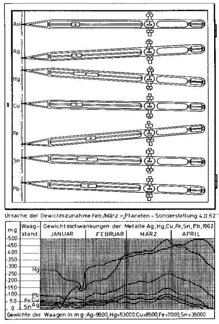 В свете экспериментальных исследований автора, кажется спорным, является ли действительной гравитационная постоянная, определенная Richarz и Krigar-Menzel посредством тестов на свинце. Эксперименты автора показали, что свинец, также как различные другие металлы, подчинен постоянным колебаниям веса, так что их веса только относительны. Автор сделал семь точных весов из древесины клена (рис. 37) и положил на одну сторону каждых весов золото, серебро, ртуть, медь, железо, олово и свинец соответственно. На другой стороны коромысла весов использовалась древесина клена как противовес. Затем весы были покрыты лаком, чтобы защитить их от влияния влажности. Чувствительность весов была откалибрована согласно соответствующему несомому грузу. Полный диапазон индикации составлял 1/10 веса, несомого каждыми весами с отклонением, составляющим 130 мм. В ходе двухлетнего испытательного периода стало очевидно, что наши веса увеличиваются от самой дальней точки до солнца (афелий) до самой близкой (перигелий), а оттуда и до следующего афелия – уменьшаются на то же значение. Далее автор выяснил, используя эти весы, что гравитация различных планет оказывает увеличивающее или уменьшающее вес влияние на определённые металлы соответственно. Это становится наиболее очевидным, когда планеты находятся на на противоположных позициях. Максимальные отклонения весов позволяют установить со всей уверенностью и точностью до часа, какой металл приписывается к нахождению планет на противоположных позициях, и в каком часе достигается это нахождение. На данный момент автор выяснил, что есть связь между металлом ртутью и планетой Меркурий, равно как между свинцом и Сатурном. Дальнейшие испытания в процессе разработки. [Ср. воспроизведение эксперимента в Гравитационном Эксперименте.]