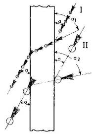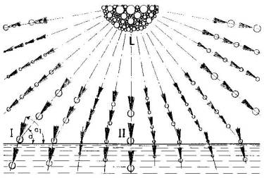 Рис. 39 схематично показывает два луча I и II исходящие из одного и того же источника света, где I идёт из воздуха и поражает водную поверхность под острым углом. Этот первый случай ясно показывает, что энергетический шар, благодаря своей сферической форме, определённому диаметру, углу излучения a, и энергии воздействия c = (m•v2)/2, разворачивается к углу излучения a1 и продолжает своё движение в воде под этим углом. Когда, как в случае II на рис. 39, луч света поражает водную поверхность под прямым углом, так что вихрь излучения a совпадает с перпендикуляром к углу атаки, шар не разворачивается, и луч света не преломляется, независимо от различий в диаметрах энергетических шаров и природе прозрачного вещества.