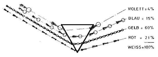 Когда мы прослеживаем индивидуальные ракеты относительно их размера в процессе прохождения через призму, мы понимаем - также, как с рис. 40 - что самые большие ракеты видимого спектра, когда они сталкиваются с наклонной поверхностью призмы, имеют больший импульс отклонения в соответствии с их большим сферическим радиусом и таким образом отклоняются призмой в более высокой степени. При выходе из призмы, ракета находит поверхность выхода призмы под углом, являющимся точной противоположностью угла поверхности входа. Следовательно, полушарие, которое вступило в призму сначала, выходит последним, так что снова создаётся импульс отклонения, который вынуждает ракету еще раз отклоняться с тем же самым угловым значением. Когда мы прослеживаем траекторию самой маленькой ракеты видимого спектра таким же образом, мы понимаем на входе и выходе, что, из-за меньшего сферического радиуса, импульс отклонения, также как отклонение, в этом случае меньше. Все ракеты различных диаметров между этими двумя крайностями получают отклонение согласно своему импульсу отклонения, который зависит от их сферических радиусов, так что мы получаем в видимом диапазоне между фиолетовым - самый большой диаметр ракеты - и красным - самый маленький диаметр ракеты - полный фиолетово-сине-желто-красный цветной спектр, в котором переходные цвета индиго-зеленый-оранжевый появляются от смешения фиолетового и синего, синего и желтого, желтого и красного. Диаметр ракеты ультрафиолетовых лучей даже больший чем таковой фиолетовых лучей. Поэтому они не проникают в стекло, имеющее более узкий проходной диапазон, и задерживаются или поглощаются при прохождении через жидкости и газы в результате их большего сопротивления. С другой стороны, диаметр ракеты невидимых ультракрасных лучей даже меньше, чем таковой красных лучей. По этой причине, эти ракеты имеют большую проникающую силу, то есть более низкое сопротивление против прохождения через газы и жидкости, чем лучи других цветов или ракеты с большими диаметрами. Отношение между диаметрами красных фотонных ракет и диаметром фиолетовых фотонных ракет пропорционально углу преломления красных и углу преломления фиолетовых световых лучей. Рис. 41 далее иллюстрирует приблизительный процент расстояний между последовательными ракетами различных цветов или, другими словами, приблизительное отношение смешивания индивидуальных ракет в единицу времени. Следующий эксперимент также предоставляет свидетельство правильности состава белого света из основных оттенков спектра, то есть красного, желтого, синего, и фиолетового. Если измерить значение яркости белого света, проецируемого на экран через призму, это значение равняется сумме отдельных значений спектральных цветов красного, желтого, синего, и фиолетового из той же самой призмы при условии, что измерение выполнено при тех же самых условиях – расстоянии до экрана и интенсивности освещения – что и с белым светом. Процентное распределение измеряемых значений около линий Фраунгофера A D G и H грубо будет следующим: красный 21 %, желтый 60 %, синий 15 % и фиолетовый 4 %. Следовательно, химический эффект цветных лучей зависит скорее от качественного, чем от количественного условия. Хотя эффективная энергия ракеты всех цветных лучей одинакова, как очевидно из скорости распрост