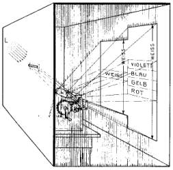 Главное возражение, снова и снова выдвигаемое последователями теории цвета Гете против мультицветового состава белого света – это мнение, что смешивание индивидуальных цветов путём вращения цветового круга даёт не чистый белый цвет, а грязный серый. Причина, однако, в том, что смешиваемые цвета – это не чистые спектральные цвета, кроме спектральных цветов, собранных в одном месте выпуклой линзой. Последователи теории цвета Гете отрицают это последнее доказательство, потому что думают, что состояния напряжения белого света, вызванного призмой нейтрализуются выпуклой линзой. Следующий эксперимент, который автор повторил несколько раз, чётко опровергает все эти нелогичные возражения. Когда чистые спектральные цвета, сортируемые призмой, смешиваются быстрым, колебательным движением призмы, как показано на рис. 42, на экране появляется чистый белый свет. Если колебательное движение замедляется, спектр становится видимым сначала только на точках возврата, и становится видимым на всём пути только если движение замедляется и далее. Чтобы определить, кажется ли колеблющийся спектр действительно белым против белого солнечного света, делается вторая призма того же размера для участия в колебательном движении первой призмы, причем вторая призма смещена на 120 угловых градусов, так чтобы не спектр но только белый свет попадал на экран от этой призмы рядом со спектром первой призмы. Когда обе призмы исполняют то же самое колеблющееся движение, ни малейшего различия не обнаруживается между этими двумя полосами света. Относительно этого эксперимента, нельзя говорить, что состояния напряжения нейтрилизуют друг друга.
