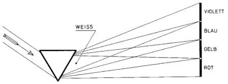 Второе возражение, выдвинутое Гете тогда и повторенное всеми его последователями в настоящее время, состоит в том, что сразу позади призмы глаз не различает никаких цветов, но только белый свет. Но если объективно проследить путь луча через призму к экрану как показано на рис. 43, обнаруживается, что сначала белый свет попадает на всю входную грань призмы. Как было упомянуто ранее, все фотонные ракеты различных размеров смешаны в белом свете, проходят пространство без порядка и попадают на входную грань призмы в этом состоянии; они следуют своему пути через призму согласно своему отклонению к наклонной противоположной выходной грани и отклоняются там еще раз. Благодаря двойному, то есть полному, отклонению, фотонные ракеты, выходящие из второй грани призмы, имеют почти те же различия размеров и расстояний, что и во время их входа в призму. Из-за отличающихся диаметров, они отклоняются друг от друга в своих дальнейших траекториях, так что видимый спектр от красного до фиолетового становится когерентным только на определённом расстоянии между призмой и экраном с шириной спектра в зависимости от ширины выходной грани призмы. Весьма очевидно, что глаз может различать только белый свет позади выходной грани в пределах точно определимого светового клина (рис. 43) потому что этот световой клин содержит все цветные фотонные ракеты, которые достигают глаза и создают в своей полноте восприятие белого света. Если принять во внимание, что согласно Ramoeny/Cajal каждый квадратный миллиметр сетчатки напротив апертуры входа глаза содержит в среднем 13,000 нервных окончаний плюс восприимчивые элементы типа палочек и колбочек, каждый поймет, что, из-за почти невообразимых маленьких диаметров фотонных ракет, последние выделяют свой заряд между палочками и колбочками, таким образом создавая в этой крошечной области восприятие, соответствующее их разрядке, которое, если все цветные фотонные ракеты, встречающиеся в белом свете, разряжаются одновременно, является "белым" восприятием. Рис. 43 далее показывает, что область вне белого светового клина больше не содержит все цветные фотонные ракеты, но только фиолетово-синие и красно-желтые. Перекрывание или смешанные цвета индиго-зеленый-апельсин были опущены. Таким образом, только часть фотонных ракет снаружи белого легкого клина попадает на сетчатку наших глаз, так что мы никогда не можем различать эти краевые лучи как белый свет, поскольку он воспринято в пределах белого клина фотонных ракеты позади выходной грани призмы. Таким образом, второе возражение теории цвета Гете также становится несоответствующим.