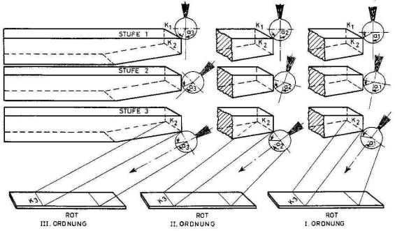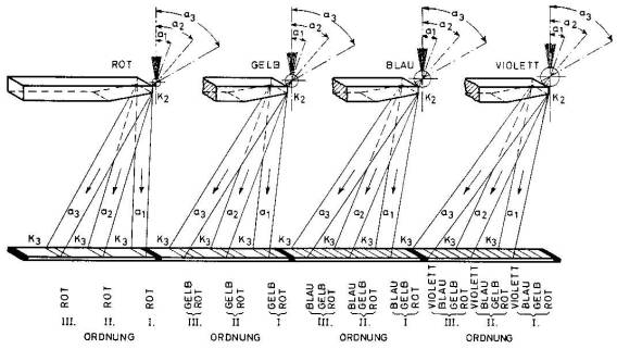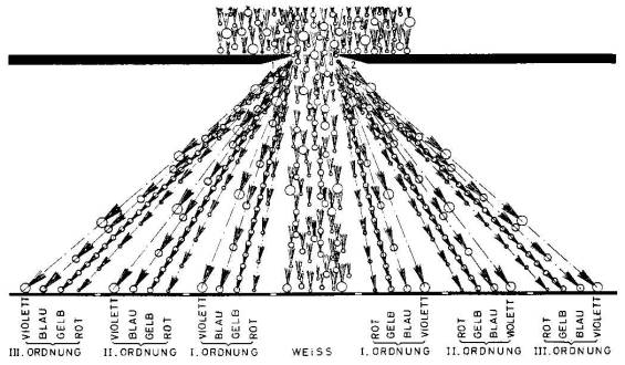 Наконец, рис. 46 показывает формирование полных спектров 1-го, 2-го, и 3-го порядков путём вставки увеличивающихся цветных ракет желтый-синий-фиолетовый. В соответствии с увеличивающимися ракетными диаметрами, увеличивается отклонение по причине увеличения импульса отклонения, так что отсутствующие цвета непрерывно добавляются. Для ясности, соударения ракет были иллюстрированы только углами a1, a2, a3, а траектория – стрелками. Предполагается, что наиболее вероятно, соударения фотонных ракет на крае промежутка K1 изменяются в некоторых пределах, вызывая легкое рассеивание траекторий ракет, что становится очевидным по более широкой основной линии спектров и переходов между отдельными цветами.