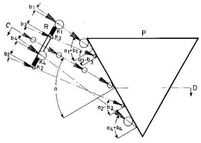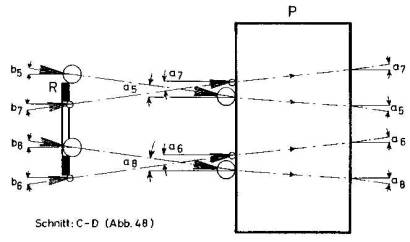 Что заставляет поляризацию уменьшаться до нуля, когда внешние и внутренние тангенсы кольца находятся под прямым углом к оси призмы, то есть что фотонные ракеты не отсортировываются согласно их цветовым значениям или диаметрам или величине, когда проходят через призму? Или другими словами: Почему мы видим световые грани под прямым углом к оси призмы без цветных граней? Как показано на рис. 49, как сечение C-D рис. 48, это тот же самый принцип пути луча как в отношении плоско-параллельных стеклянных пластин, которые мы описали ранее в отношении рис. 40. Когда фотонные ракеты K5 и K6 входят в контакт с внутренними гранями кольца, они отклоняются и на входе и выходе подвергаются отклонению a5-a8 относительно перпендикулярного или параллельного смещения. Следовательно, никакая поляризация не может происходить в пределах позиции 90 °.