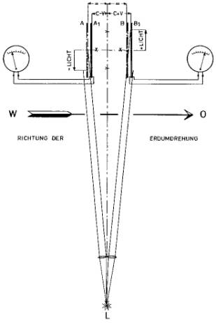 Рис. 50 схематично иллюстрирует устройство для измерения скорости света в зависимости от вращения земли. Это устройство по существу состоит из постоянного источника света L, двух фотоэлементов A-B, двух инструментов электрических дисплеев и соответствующего оптического оборудования. Всё устройство установленно на вертикальной оси с возможностью вращения. Устройство работает следующим образом: с целью калибровки весь измерительный прибор сначала вращается в горизонтальной плоскости так, что общая ось фотоэлементов принимает северо-южную, а Ось Y источника света – восточно-западную ориентацию. В этом положении калибрования считываются значения, выводимые на дисплеи. Когда вся измерительная система поворачивается на 90 °, так что Ось X фотоэлементов принимает восточно-западную, а Ось Y источников света – северо-южную ориентацию, фотоэлементы сканируются уже не равномерно, а неравно пучками лучей источников света, потому что за единицу времени вплоть до прибытия луча света, фотоэлемент А принимает положения A1, а фотоэлемент B – положение B1. Таким образом, при перемещении всей системы из ее первоначального положения в v/c отношении 1:1, сила излучения, действующая на принимающие поверхности А и В, измененяется. Таким образом, интенсивность света на светочувствительном экране A1 уменьшается, в то время как она увеличивается в том же самом отношении на экране B1. Ещё одно считывание значений, показанных на инструментах дисплея, даёт различие по сравнению со значениями, считанными в положении калибрования, и это различие пропорциональн скорости света и вращению земли. Инструмент фотоэкрана A1 показывает отрицательное, а инструмент экрана B1 – положительное значение. Поскольку угол атаки света, так же как двустороннее смещение экранов A-B в направлении вращения земли, могут быть точно рассчитаны и таким образом расценены как известные количества, увеличение или уменьшение поверхностной интенсивности может быть рассчитано с предельной точностью и считано на инструментах, калиброванных для скорости света.