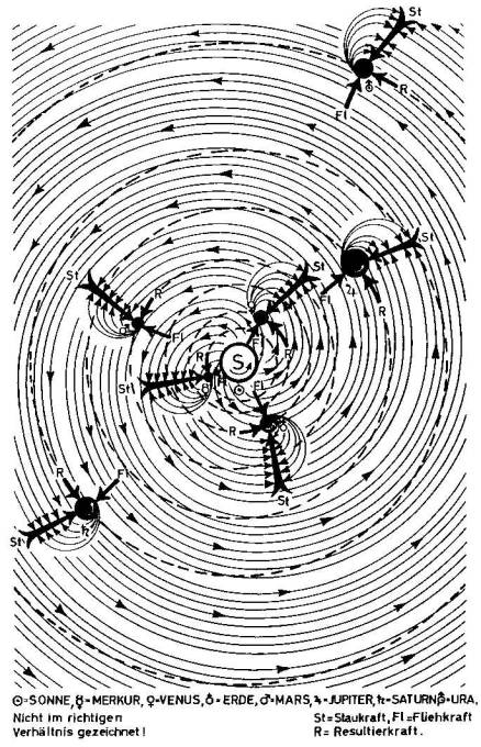 Но поскольку южный полюс солнца расположен на стороне северных полюсов планет, там существует равенство потоков между солнцем и планетами и полярностью потока на ночной стороне планет, обращённой от солнца. Эта полярность между дополнительным полем солнечного вихря земли с одной стороны и полем гигавихря солнца с другой порождает эффект накопления, результирующая сила которого придавливает землю к солнцу. Теперь, если бы поток солнечного гигавихря не был винтовым или вихревым потоком, но концентрическим кольцевым потоком, планеты придавливались бы к солнцу поперек потока, то есть радиально по кратчайшему пути. Но поскольку поток гигавихря винтовой, планеты движимы не радиально, а почти под прямым углом к направлению потока. Кроме того, поскольку направление потока спиралей меняется с каждым угловым градусом предполагаемого круга вокруг солнца, направление результирующей силы компонента накопления потока также меняется с каждым угловым градусом.