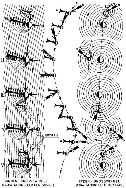 Что касается взаимовлияний, планеты, планетоиды и луны ведут себя очень похоже на множество магнитных брусков, подвешенных на определённых расстояниях друг от друга, северные полюса которых направлены в одном направлению. Этот факт взаимоотталкивающего воздействия полностью согласовывается с амплитудой ежедневных, ежегодных и вековых колебаний, особенно когда планеты Венера, Земля, Юпитер располагаются на по существу прямой линии радиально к солнцу; аналогично, это воздействие согласуется с изменением среднего отклонения во время верхней и нижней кульминации. Кроме того, геомагнитный дифференциальный двигатель очень иллюстративно демонстрирует это воздействие. При взгляде на вихревую закономерность земной луны в ее зависимости от солнечного и земного вихря, мы получаем весьма удивительные результаты. Мы ранее упомянули, что луна - подобно планетам - также захвачена гигавихрем солнца и таким образом имеет солнечный вихрь в дополнение к собственному лунному вихрю, причём оба имеют одинаковое направление потока. Поскольку луна также расположена в зоне земного вихря, часть восходящего земного вихря течёт к полюсам холода луны и становится здесь нисходящим винтовым полярным потоком. Согласно правилу вихря, этот поток направлен противоположно лунному потоку, так что мы обнаруживаем на луне два противоположных вихревых потока, которые регулируют ее вращение вокруг солнца, так же, как и ее вращение вокруг собственной оси. Поток лунного электрического вихря плюс солнечный вихрь, текущий в том же направлении, доминируют над противоположным вихрем, порождённым полем земли, так что луна вращается вокруг оси в том же направлении, что земля и другие планеты. В соответствии с проттивоположным вихрем, порождённым на луне, земля оказывает тормозящее влияние на вращение луны. Она вращалась бы вокруг своей оси намного быстрее, если бы не была расположена в пределах зоны мегавихря земли. Из-за присутствия луны, вихревое поле земли разделяется на два более сильных восходящих вихревых потока, разведённых на 180 °. Между луной и землей существует большая интенсивность накопления, потому что на этой стороне земли имеет место более сильный оттёк мегавихря земли из-за более сильного градиента по направлению к полюсам холода луны. Этот более сильный оттёк вызывает ослабление мегавихря с обеих сторон земли, в то время как на обратной стороне земли, естественно, имеет место нормальный оттёк мегавихря. Мы обнаружили, что восходящий мегавихрь является причиной вращения земли вокруг собственной оси только потому, что земная "цитадель", если можно так выразиться, отталкивается назад. Мы должны признать законность этого правила на земле и расширить его применимость также и на жидкое физическое состояние.